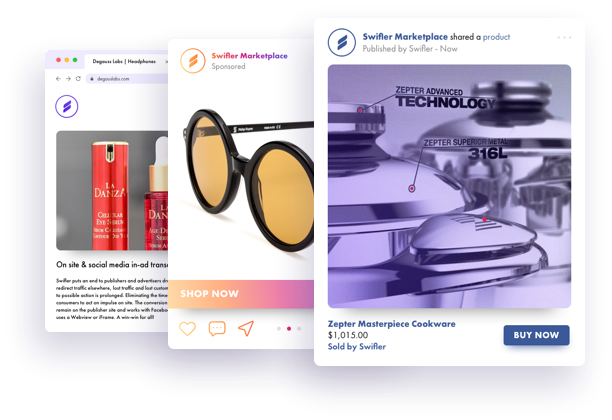 Swifler sätter stopp för det som utgivaren och annonsören fruktar: dålig konvertering för banners som omdirigerar trafik på annat håll. Förlorad trafik och förlorat kundintresse blir resultatet när tiden från intryck till möjlig handling är för lång. För att eliminera den tidsförlösta faktorn, tillåter Swifler konsumenterna att agera på impuls direkt på sidan. Konverteringen ökar betydligt och människorna förblir kvar på utgivarens sida. Det fungerar på Facebook, Snap, Instagram eller andra appar där de använder en Webview eller iFrame. En win-win situation för alla.